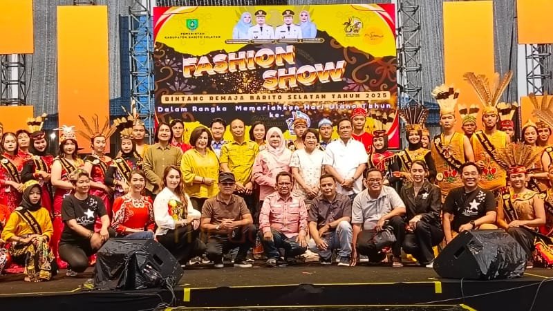 Peserta Fashion Show Bintang Remaja Barsel 2025 berfoto bersama panitia, pejabat daerah, dan masyarakat pada rangkaian HUT ke-66 Kabupaten Barito Selatan di panggung utama Expo Barsel. (foto: MediaSurya/akhmad madani)