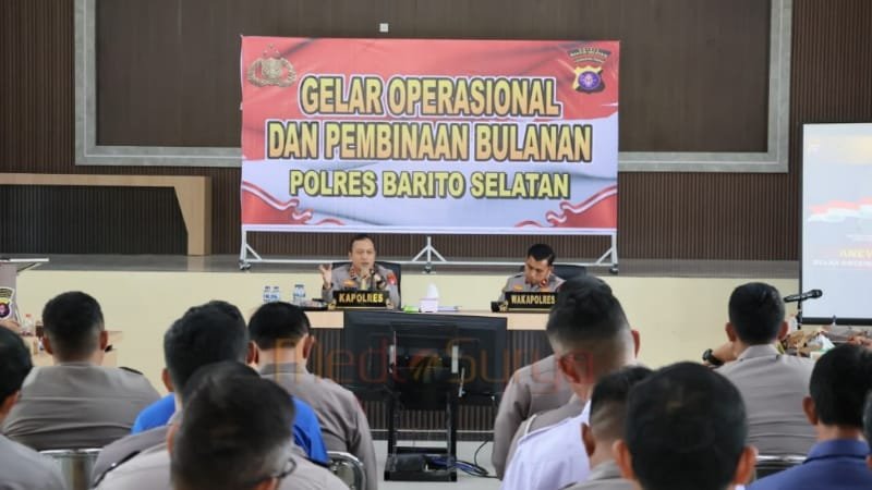 BUNTOK (MediaSurya) – Dalam rangka mengevaluasi pelaksanaan tugas satu bulan terakhir, Kepala Kepolisian Resor (Kapolres) Barito Selatan (Barsel), Kalimantan Tengah (Kalteng), AKBP Jecson Ricsko Hutapea memimpin Gelar Operasional Bulanan di Aula Tantya Sudhirajati Mapolres setempat, Rabu (12/11).