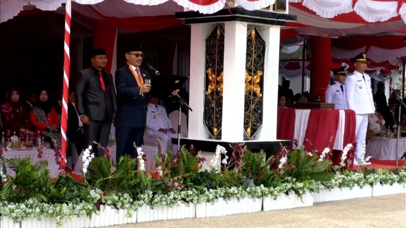 BUNTOK (MediaSurys) – Ketua Dewan Perwakilan Rakyat Daerah (DPRD) Kabupaten Barito Selatan (Barsel), HM Farid Yusran membacakan teks Pembukaan Undang-Undang Dasar (UUD) 1945 dengan lantang dan penuh wibawa pada upacara peringatan Hari Ulang Tahun (HUT) ke-80 Proklamasi Kemerdekaan Republik Indonesia (RI).
