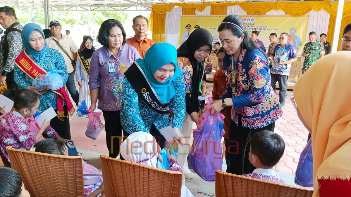 Ketua TP PKK Barsel bersama rombongan menyerahkan bingkisan kepada anak-anak PAUD pada kegiatan kunjungan kerja, sosialisasi Posyandu, dan advokasi PAUD di Kecamatan Dusun Selatan (foto: MediaSurya/akhmad madani)