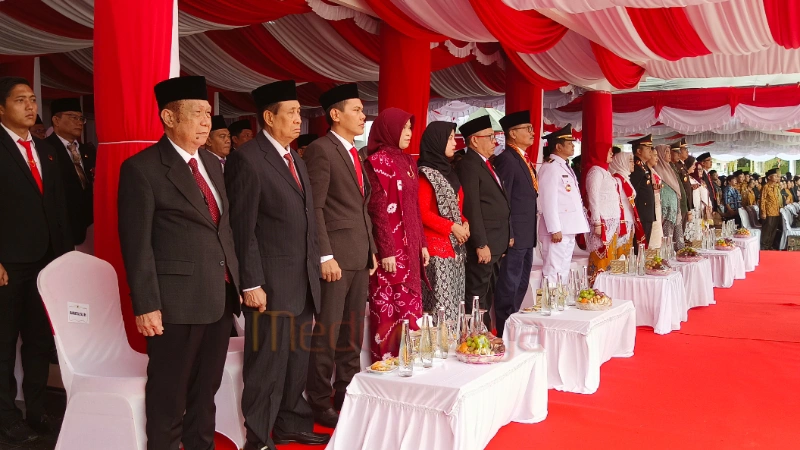 Para pejabat, mantan Bupati dan Wabup, serta unsur Forkopimda menghadiri upacara peringatan HUT RI ke-80 di halaman Kantor Bupati Barsel. (foto: MediaSurya/akhmad madani)