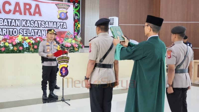 BUNTOK (Mediasurya.com) – Kapolres Barito Selatan (Barsel) Kalimantan Tengah (Kalteng), AKBP Jecson Ricsko Hutapea memimpin upacara Serah Terima Jabatan (Sertijab) Kasat Samapta Polres setempat.