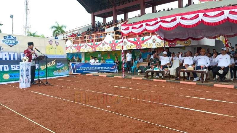 Wakil Bupati Barito Selatan Khristianto Yudha memberikan sambutan saat membuka Turnamen Sepak Bola Bupati Cup 2025 di Stadion Batuah Buntok. (foto: MediaSurya/akhmad madani)